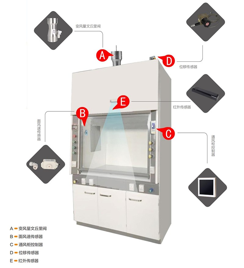 智控达UBC自适应控制系统工作原理:系统由通风柜控制器,面风速传感器,位移传感器,文丘里阀/蝶阀,红外传感器,电源控制箱组成:在VAV变风量控制系统基础上,加装红外感应传感器,当有人在通风柜前操作时,通风柜面风速按照恒定的取值(0.4-0.6M/S)运行,当红外传感器察觉通风柜前无人操作时候,则面风速可自动降至最低值(一般是0.3M/S),在保证通风柜的基本保障面风速的情况下,最大限度的降低排风量,从而达到节能减排的效果