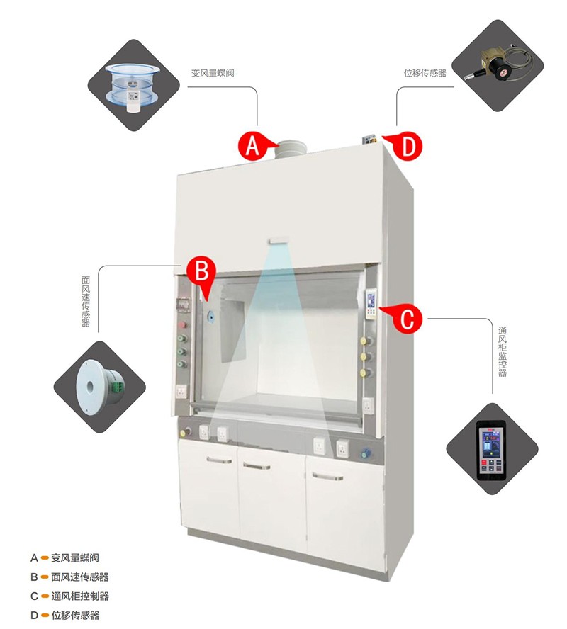变风量控制系统工作原理:变风量控制是通过实验室内通风柜窗门开度的变化调节系统的送、排风量,从而保障无论调节窗开度如何,始终可以精确控制通风柜面风速为0.3-05m/s